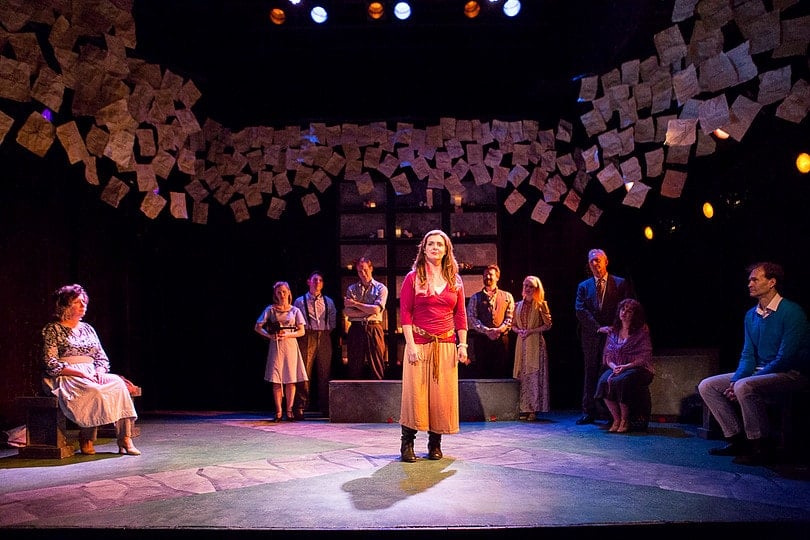 Andrew Diaz’s grey-toned scenic design makes good use of the small stage, creating a backdrop of wall tombs with candles to set the locale, instead of a field of tombstones that would crowd the space and limit the ensemble’s movement. Stone benches and ceramic lattice-work garden stools provide apropos seating, and yellowed papers inscribed with epitaphs are suspended above, to evoke the show’s source in Masters’ poetry.