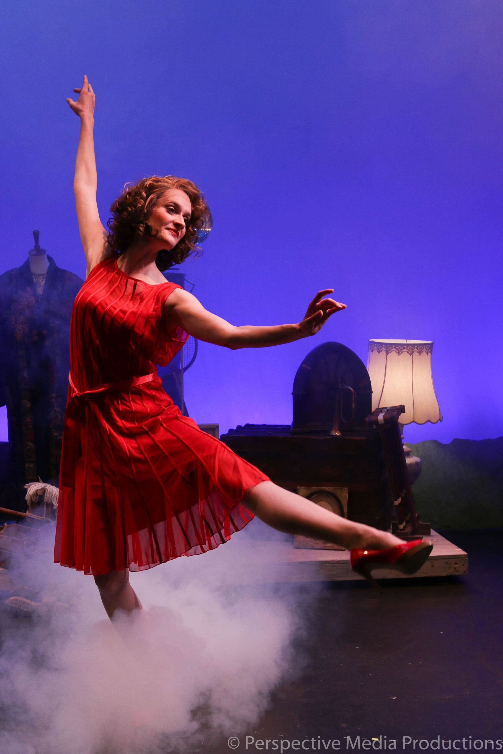 Vintage styles of dress, formal wear, and military uniforms by Tina Heinz have an authentic look, while cleverly distinguishing between the vibrant red worn by the Dreamer and the muted shades of the Dreams. The stepped platforms of the set, designed by Bart Healy, facilitate the dancing and blocking of the actors, though are not typical features that one would expect to find in a real attic space. But then again, the Ritz’s new musical vision of the past is all a Dream!