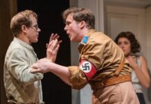 D.T. Willis’ stunning wooden set works perfectly for this production, and is gorgeously highlighted by the work of Lighting Designer Zach Blane. Great costumes by Matthew Solomon and sound by designer Laura Shubert round out the entire show. The band, here conducted by Jeff Theiss, performed this iconic score magnificently. Oklahoma! is a fabulous show that has maintained its popularity for decades.
