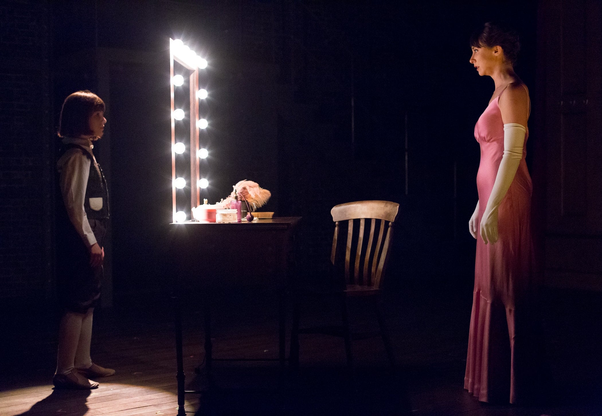 James Krozner’s set smartly suggests both the storybook frame of “A Musical Fable” and the proscenium stage of a theater, which easily switches from inside to out with the opening and closing of the red stage curtain and the movement of a few pieces of furniture. Adorning the exterior pillars are ornately framed video projections by Jorge Cousineau that identify the changing locales, acts, and venues. Lighting by Thom Weaver is appropriately theatrical, and costumes by Richard St. Clair capture the period and the personalities (with the particularly amusing use of a hotel blanket for Rose and the girls, and June’s stunning white coat with glittering rhinestones and a silver appliqué of the New York skyline).