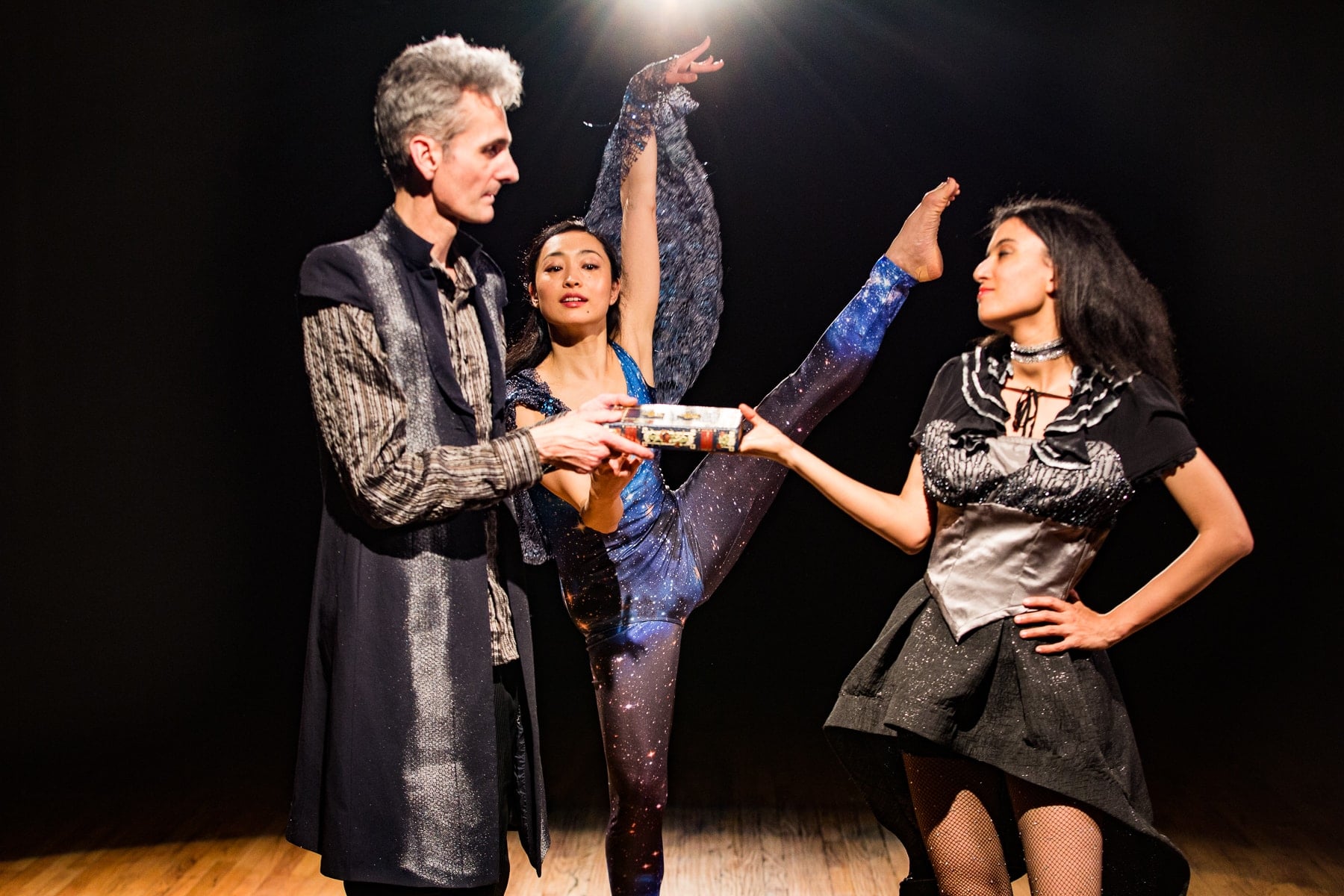 Highlights of the show include the original otherworldly music composed by live musicians Topu Iyo and Mike Thies, and sung by cast members Erkin Osmanli, Gillian Bennett, and Michelle Tsai (the duets by Osmanli and Bennett are especially evocative). Dancers Yukari Osaka, Mizuki Sato, Emily Morrison, and Laura Bowers execute Susan Tenney’s seemingly weightless choreography with exquisite grace, beauty, and fluidity, as they float through the space (accentuated by Janet Mervin’s cosmic costumes) and impress with their stunning extensions. All of the musicians, singers, and dancers succeed in setting a haunting mood that transports us to another realm.