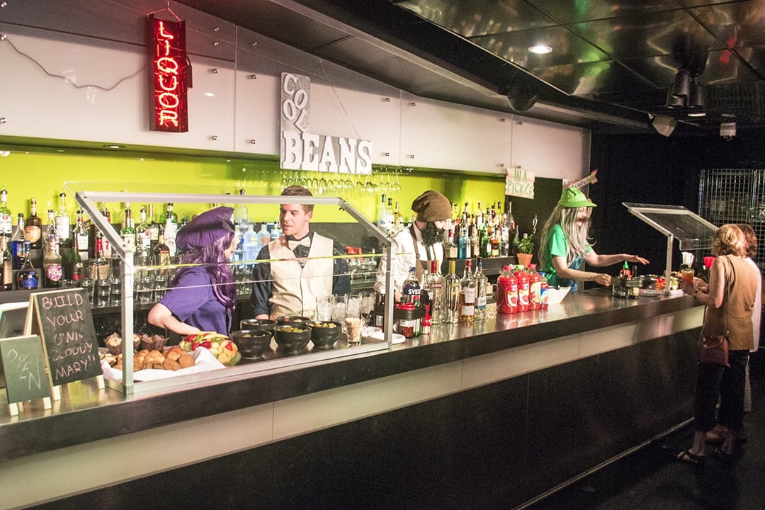 Beginning with alternate accounts of the invention and naming of the Bloody Mary in the early 20th century, a presentation of favorite garnishes for the drink and how they are prepared, and the identification of the five basic tastes detected by our tongues (sweet, sour, salty, bitter, and savory – or umami, as it was called by Kikunae Ikeda, the Japanese chemist who first recognized it in 1908), the show is filled with fascinating facts and amusing anecdotes delivered by the cast through dialogue, song, and dance. Closing the first act is a lesson on the development of Irish Coffee, a demonstration of its proper preparation (the beans must be precisely ground and steamed; the cream must be correctly aerated to float on top), and a glimpse into the origins of the consumption of coffee beans, dating back to the story of a 9th-century Ethiopian goat (in a side-splitting portrayal by Schaffer), and then highlighting the different types of Italian coffee drinks in a hilarious Pulcinella-style puppet show and a lively ditty about “Coffee for Everyone.”