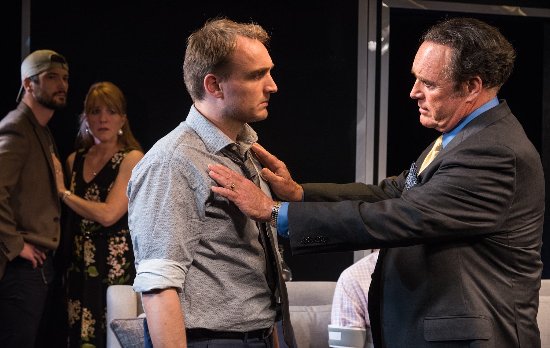 David M. Lawson’s sound design sets the stage for the timely narrative with relevant news reports and noisy throngs of reporters heard each time the protagonists’ door is opened. James Noone provides an efficient set that allows the actors to move around the living room (a few stuffed animals are a heartbreaking touch), on and off the stage to an unseen bedroom, and outside the home to address the questioning crowds – with the audience serving as surrogates, left to weigh the opposing sentiments. Lighting by Zach Blane gives focus to Big Jim’s fervent sermons, and costumes by Teresa Snider-Stein are in keeping with the personalities of the figures.