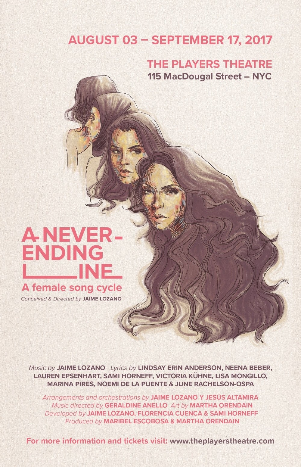 Conceived by Composer and Director Jaime Lozano as a loving tribute to the women in his life and his matriarchal upbringing, A Never-Ending Line, produced by Maribel Escobosa, Martha Orendain, and Victoria Kühne, presents a cycle of seventeen songs written by nine female lyricists set to his original music. The show, which made its New York debut at the Metropolitan Room in July, following earlier performances in Paris and Monterrey, Mexico (where it was translated entirely into Spanish), is now playing a limited run at The Players Theatre, with an all-female cast and orchestra, giving voice to a sampling of personal experiences and perspectives.