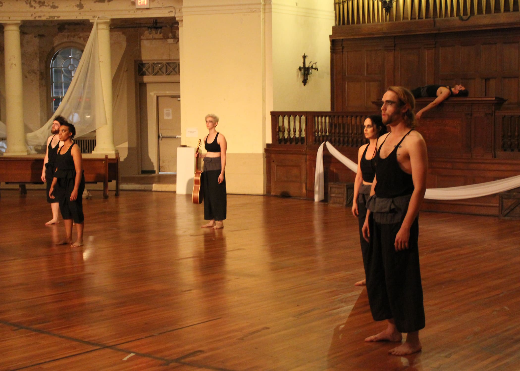 Featuring Keith Conallen in the titular role, Van Sciver as his daughter, and Chris Anthony as the narrator John Gower, with Kayla Anthony, Andrew Carroll, Colleen Corcoran, Anthony Crosby, Ife Foy, and Shamus McCarty filling out the omnipresent ensemble, all of the performers affirm their eloquence with the language and the emotions of the Jacobean text, and evince their harmonic vocal skills with the transportive songs. They also contribute elemental sounds and primal movements that evoke the story’s shifting moods and locales (conjuring the wind, the waves, and the motion of the ship with their rhythmic breathing and interpretive motions), thereby fleshing out the minimalist attire, props, and bare-stage set (for which Joe Wozniak served as Design Associate) and setting fire to our imaginations, as all great art should.