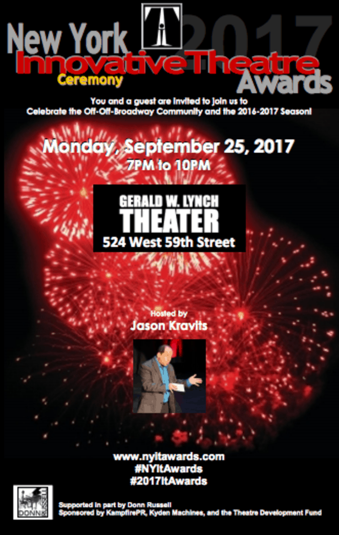 The 2017 New York Innovative Theatre Awards Ceremony was held on Monday, September 25, 2017, at the Gerald W. Lynch Theatre, John Jay College of Criminal Justice – 524 West 59th Street, NYC. For more information, and a full list of nominees, go online.