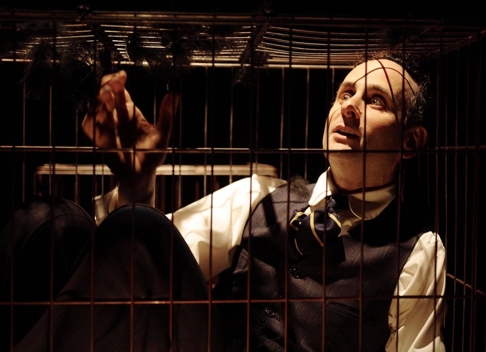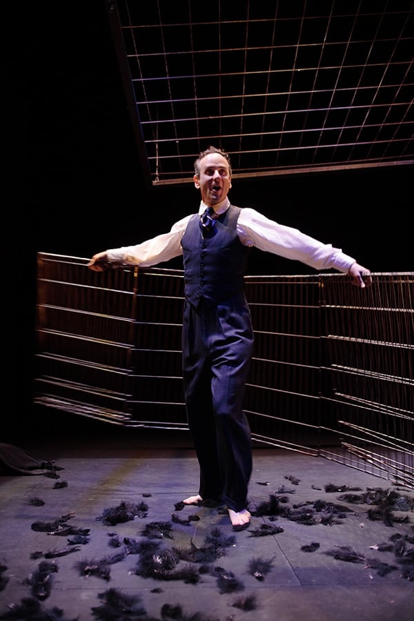 A redolent design provides telling support for Nashman’s portrayal. The set, by Marysia Bucholc and Camellia Koo, comprises a metallic cage, box, bare bed frame, and folding gate, all of which are used to potent effect in expressing the son’s feelings and giving physical form to the inescapable sense of confinement he felt under his father’s command, while copious black feathers signify everything from his writing pen to the darkness that surrounds him to the need to shed the plumage of his family in order to grow (the name kavka translates to jackdaw, a species of crow). Osvaldo Golijov’s original soundscape (pre-recorded by the St. Lawrence String Quartet) and Andrea Lundy’s dramatic lighting and looming shadows are perfectly synchronized with Nashman’s movements, and serve to heighten the eerie tone of Kafka’s personal story. Barbara Singer’s costume design of a vintage-style suit is effectively reconfigured to illustrate unnerving memories of swimming, the happiness Franz imagined was felt by others, and – referencing his famous novella The Metamorphosis – the transformation effectuated by his seminal letter.