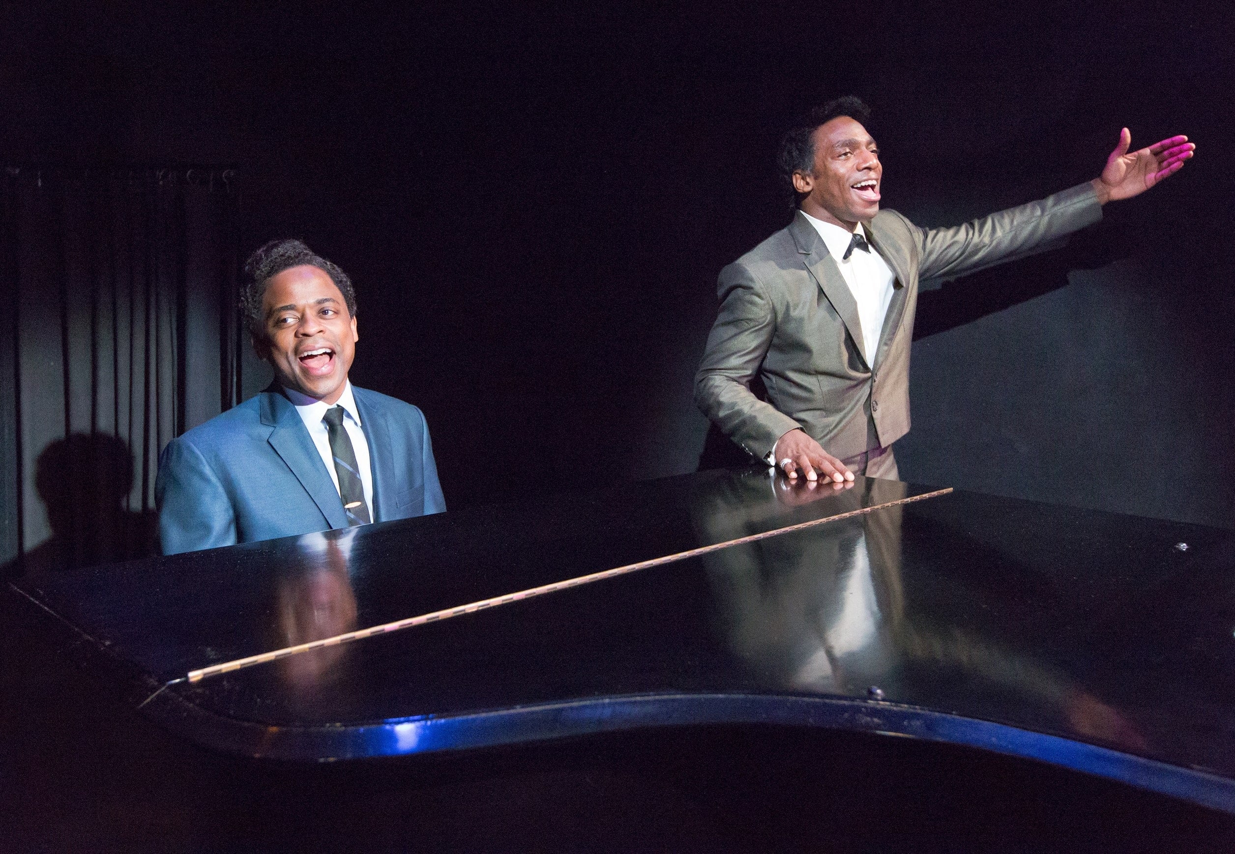 Dulé Hill leads a stellar cast in the titular role, capturing a full range of conflicting emotions, delivering pitch-perfect renditions of his character’s famous jazz-infused pop songs and sophisticated style, and smoking and coughing from the omnipresent cigarettes that would ultimately claim his life. Daniel Watts is thoroughly entertaining as the vivacious Sammy Davis Jr., who interacts wildly with his castmates and the audience, invites the at-first-hesitant Cole to a tap-dance duet to “Me and My Shadow” that brings down the house (choreography by Jared Grimes), and advises his more restrained friend to “go out with a bang” from his TV show. Zonya Love as Nat’s mother Perlina provides another show-stopping number with her powerhouse vocal on “Orange Colored Sky,” as does Gisela Adisa in her dual roles as the seductively purring Eartha Kitt and Nat’s daughter Natalie, with whom Hill performs the aptly-named “Unforgettable” (here alive together, not posthumously on tape, as in the hit track of 1991). Rounding out the cast and giving fine support are Jo Twiss, Marc D. Donovan, and Owen Pelesh as the TV crew, Rachael Duddy as singers Peggy Lee and Betty Hutton, and Dayshawn Jacobs as both the young Billy Preston and the young Nat, who takes up music following an unprovoked childhood attack on him (fight direction by Samantha Reading).