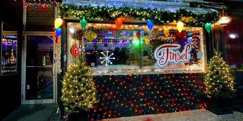 Philadelphia’s Midtown Village is a whole lot brighter this year with the opening of Tinsel, a new Christmas pop-up bar in the space occupied for over 100 years by Simpson’s Jewelry. The sparkle of diamonds has been replaced by the twinkle of holiday lights of all types and colors, and the former jewelry counter has been transformed into a 25-foot twelve-seat bar, serving up a menu of seasonal concoctions that are sure to add to your holiday cheer.