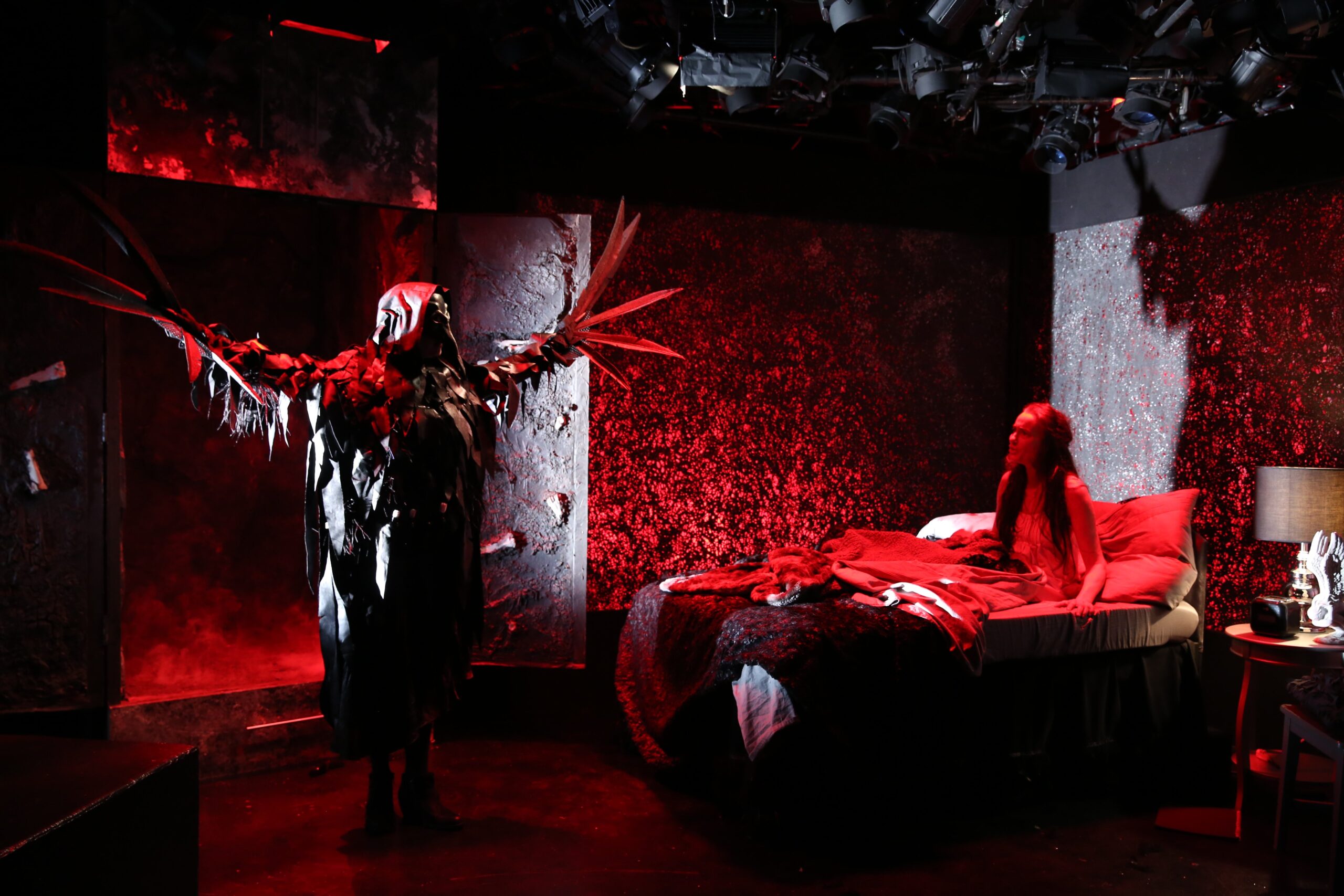 Along with her penetrating analyses of the personalities and motivations, Carr’s expressive script incorporates telling references to the history of literature and the arts, from the universality of Shakespeare’s writing (Hamlet’s “poor Yorick”), to the romanticism of Chopin’s music, and the uncompromising naturalism of Caravaggio’s painting (The Death of the Virgin, in the collection of the Louvre). She also employs traditional vanitas iconography (with the Woman’s darkly humorous examination of herself in a mirror and appreciation of the “graveyard chic” of her emaciated visage), Biblical stories and metaphors (the Resurrection of Lazarus), and the familiar imagery of death (personified here as a sharp-beaked, black-feathered, and long-taloned crow that pecks at the Woman’s face, draws her blood, and spreads its wings to stifle her last breath).