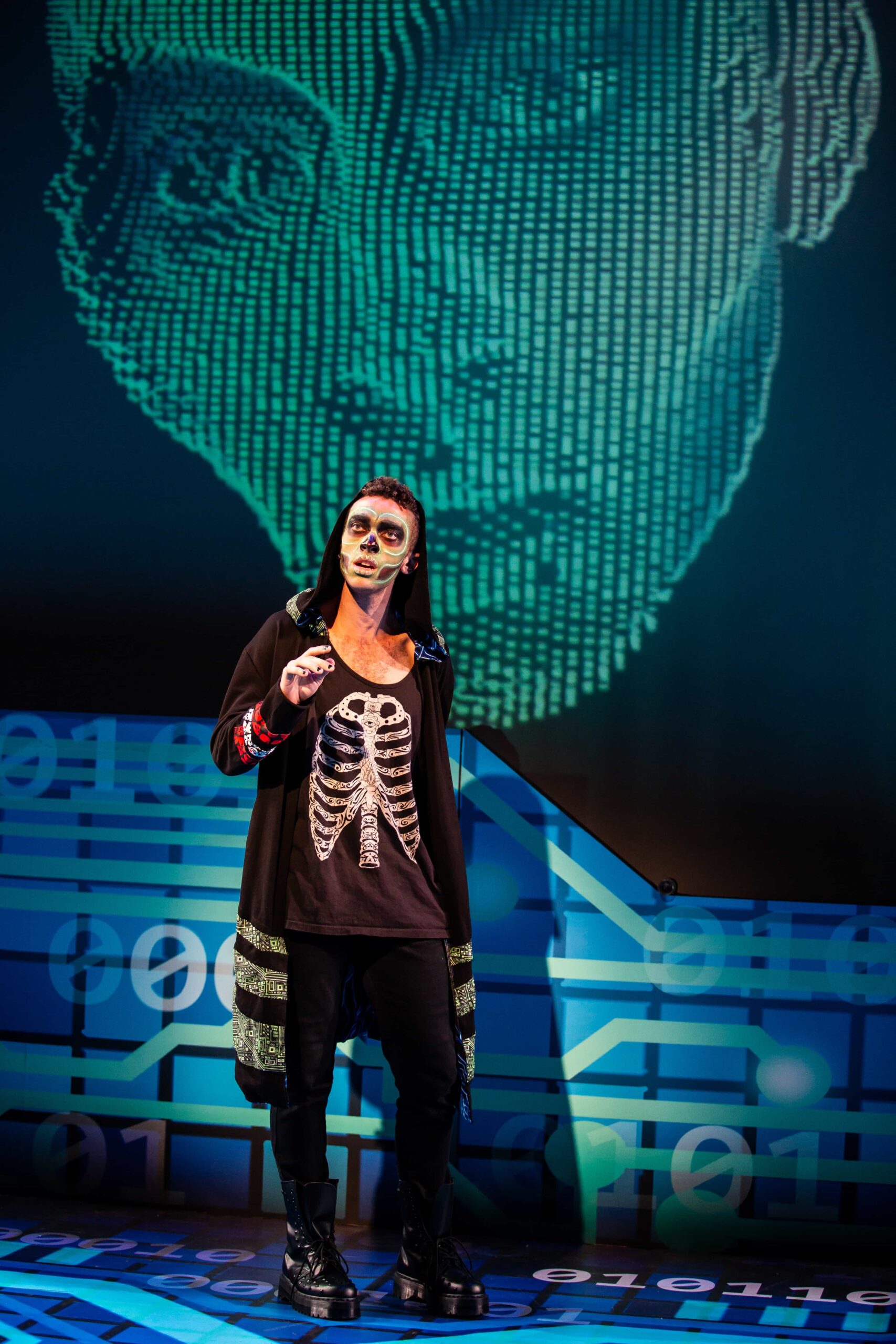 The terrific cast, directed with high energy, humor, and heart by Thomas Caruso, features the ever-outstanding Lesli Margherita as the Princess, who rules Emojiland with a hilariously camp indifference to the needs of her digital populace and is happy to let them know that “Princess Is a Bitch.” Jordon Bolden turns in a haunting performance as Skull, the purveyor of doom and gloom inspired by the tragic existentialist angst and gravitas of Hamlet; his macabre prologue and stirring vocals (“Cross My Bones” and “Thank Me Now”) are among the highlights of the show. Co-creators Keith and Laura Nicole Harrison appear as Nerd Face (the new brainy emoji and expert techie whose knowledge of “Zeroes and Ones” is unsurpassed) and Smize (with a smiley face and smiling eyes on the outside, but “Sad on the Inside”) – the central simpatico pair that might get a second chance at connecting if only he can save the program from the destructive virus that would make it freeze and crash.