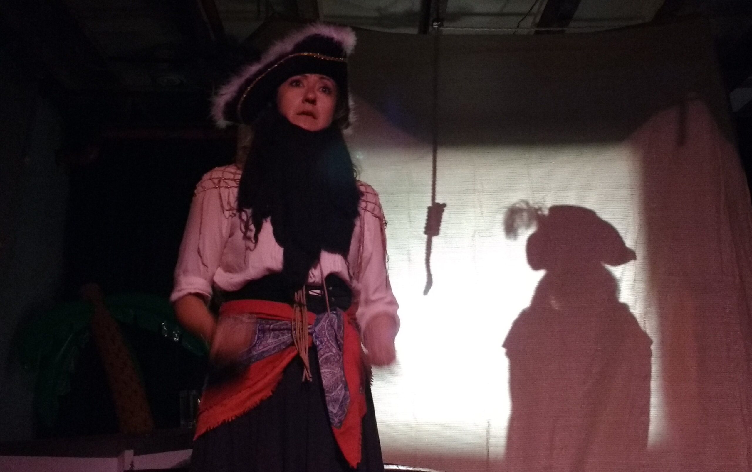 In addition to all of the levity, there are moments of serious reflection. A moving rendition in verse and song of the “Ballad of Captain Kidd” (unjustly executed for piracy in 1701), featuring Hoover in a full beard and sporting a Scottish accent, is supported by a background shadow play silhouetting DiMattei (as Hoover’s double), Chesney, and Stark re-enacting the drama of his hanging. And the shameful history of the transatlantic Triangle Trade, bartering rum for slaves, is handled with honest sensitivity and forthright poignancy, as the actors’ shift their moods accordingly.