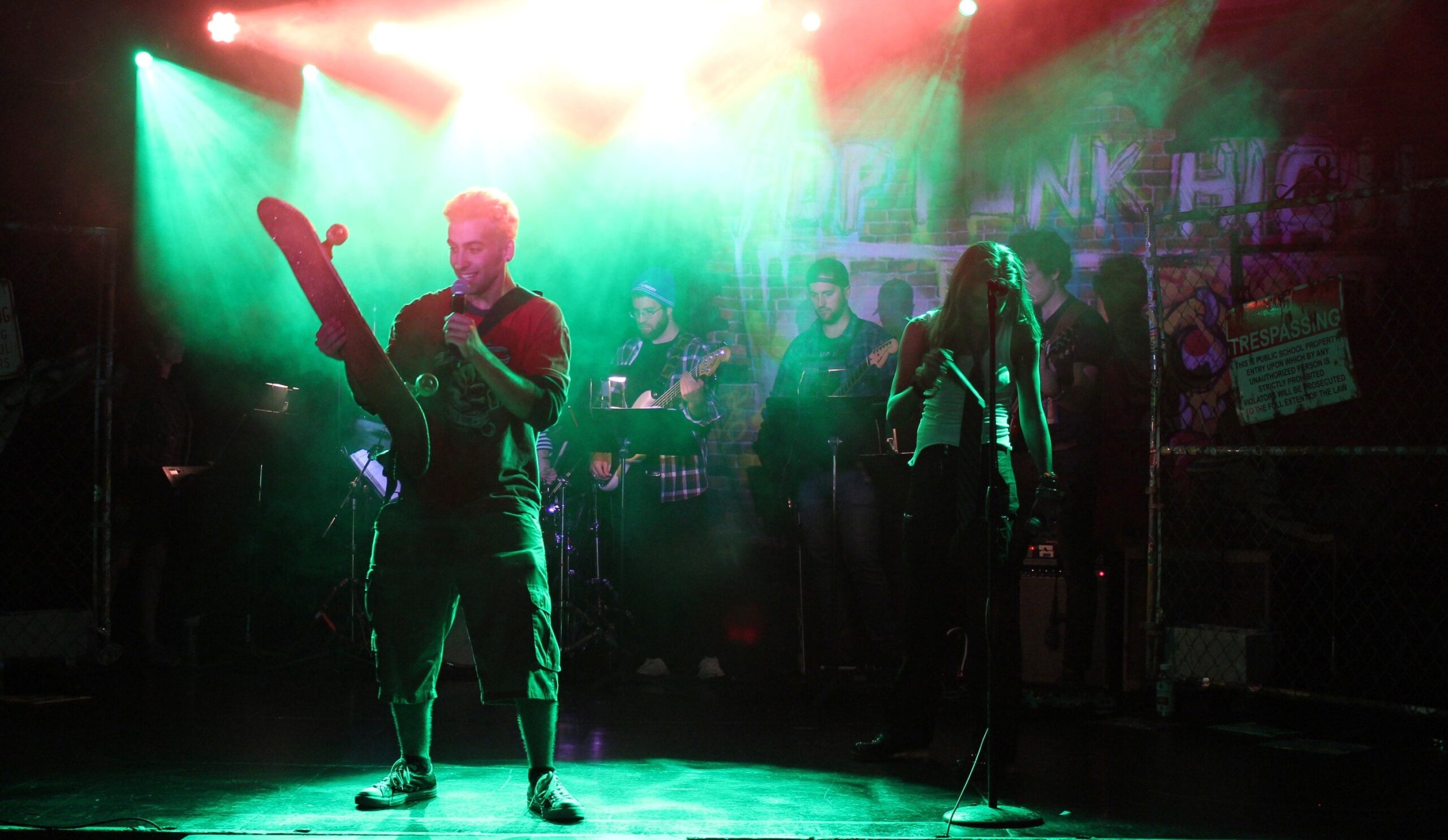 Set at a fictional high school dedicated to the eponymous genre during the 2003 academic year (when the music of Green Day, blink-182, and Sum 41 was all the rage), the wildly comical and stridently raunchy story revolves around Derek (played by Lapidus), a “needle-dick poser” who dreams of being the cool guy and his school’s new Pop-Punk King. It all becomes possible with an aerosol can of AXE Body Spray stolen from the office of the principal (Jacob Grover), which conjures the “ghost-slash-genie” of pop-punk icon Avril Lavigne (Kelly Krauter), who will grant him three wishes – a top-of-the line skateboard for defeating the principal’s son Skeet (Patrick Sweeney) in front of their classmates; beating him again in the annual Battle of the Bands; and growing a fifteen-foot penis – all in the hopes of enabling him to take the hot girl Amanda Bunkface (Jess Kaliban), “the Avril of my eye,” away from his nemesis. But there is one condition: Derek must find Lavigne’s killer and doppelganger, with the help of his best friend and class valedictorian Tib (Amanda Centeno), to release her from eternal confinement in the can.