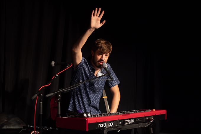 Among the many skills he displays in the show are his perfect comic timing, emotional expressiveness, mastery at improv, blockbuster vocal range and breath control, and expert musicianship on keyboard, guitar, and percussion. He also dazzles as a master techie, recording, overlaying, and looping segments of songs, speech, and instrumentals live on stage, then playing them back to create the effect of a full band accompanying his solo performance (the most jaw-dropping is his double-layered alternating deliveries of every other syllable in a song, which were flawlessly merged and complete when replayed). He is supported by a clear sound design by Craig Bundy, mood-appropriate lighting by Brandon Bogel, and scenic consultation by three-time Tony Award-winner Scott Pask (The Book of Mormon), on the minimal focused set of instruments and lights in front of a stage curtain.