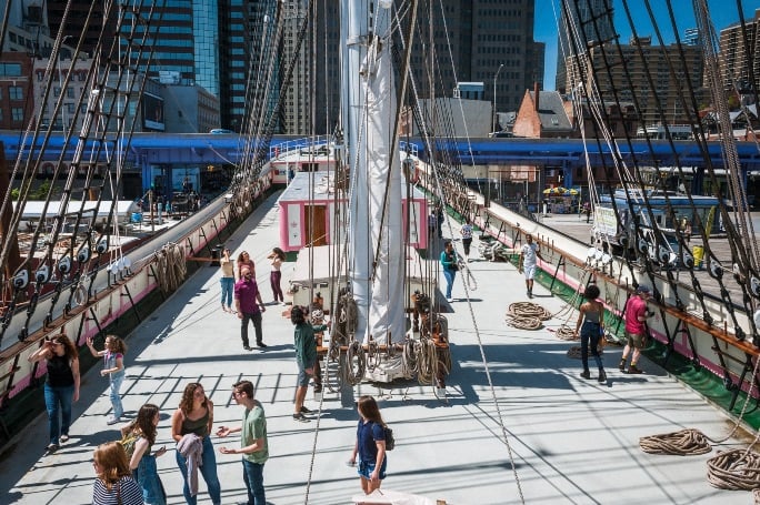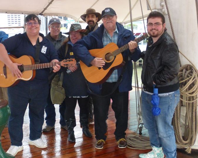 Guests must walk up a few stairs and along an angled gangway to board the ship. Before or after the sing, participants are invited to tour the Seaport Museum gallery exhibitions at 12 Fulton Street, as well as to visit the rest of the Wavertree and the 1908 lightship Ambrose on Pier 16, all free of charge. Each singalong includes a look at some objects from the Museum collection related to the songs being sung; many also include a chat with a member of the crew.