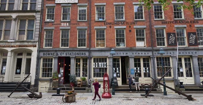Located in the heart of the historic seaport district in NYC, the South Street Seaport Museum preserves and interprets the history of New York as a great port city. Founded in 1967, the Museum houses an extensive collection of works of art and artifacts, a maritime reference library, exhibition galleries and education spaces, and an active fleet of historic vessels that all work to tell the story of “Where New York Begins.” In addition, on June 18, after the long pandemic hiatus, the Museum announced the reopening of Bowne & Co. Stationers’ brick-and-mortar storefront. Established by Robert Bowne in 1775, the working historic print shop remains New York’s oldest business still operating under the same name.