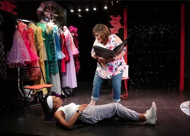 An eye-catching design further references the absent Vincent, in a vanity table and mirror surrounded by marquee lights, a delicate crystal chandelier, a glittering tinsel curtain in the doorway, and a rack of flamboyant drag costumes and shelves stacked with wigs, in every color of the rainbow (set by TJ Greenway; lighting by Alex Denevers; costumes by Ben Philipp). The character-defining costumes also serve to distinguish between the different personalities, with the tasteful contemporary outfit of Michelle, the less refined flashy taste of Paulanne, and the worn plaid shirt and basic pants and shoes of Vernon. Sound by Morry Campbell, including the audio of the TV episodes Vern watches, also contributes effectively to the atmosphere and content of the narrative.