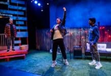 As Eduardo’s dear friend, mentor, and revered actress Marjorie, Sharon Ullrick (filling in for Crystal Field on the date I attended) delivered a fully rounded and engaging performance, from their laugh-out-loud funny warm-ups and rehearsals of Tennessee Williams’ one-act play Talk to Me Like the Rain and Let Me Listen, to her sage and adamant advice on being an actor, to her steady decline from terminal liver cancer but determination to live out what time she has left to the fullest. Heather Velazquez as Donna – the married young actress with whom Machado has an ongoing liaison – is determined to have them divorce their respective spouses to be together, and in one of the most hilarious scenes, to undergo a ridiculous ritual to cleanse them of their bisexuality once AIDS is on the rise.
