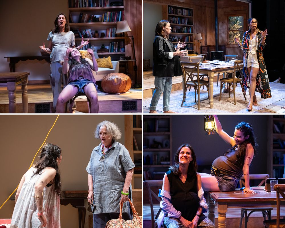 There is an attractive naturalism in the Studio production that steadily becomes bizarre. The set design by Emmie Finckel is a charming and spacious book-lined living/dining area with a wood-burning stove, and the lighting by Colin K. Bills (warm yellows and greens with fireflies) and the sound by Daniela Hart, Noel Nichols, and Bailey Trierweiler (crickets and other woodland critters) get dialed up dramatically (along with projections by Zavier Augustus Lee Taylor) as the show turns surreal and the sisters animalistic. (Act Two ends cryptically with the gravid sisters mooing like milkcows.) The quirky costumes by Helen Q. Huang (especially the stylish outfits for Anita and the counter-cultural grub duds for Rory) are apt, the complex props challenge was met expertly by Luke Hartwood, and Jess and Rory’s unsettling fights were skillfully coordinated by Ashleigh King.