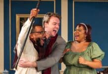 Jim Adams as Monty opens the show, explains terms and issues to the audience, and serves as a kind of trusted master of ceremony. The cast periodically breaks the fourth wall to provide clarification and bring the audience into the action. In the capable hands of Nunzio (who also designed sound and lighting), this technique defines particulars and works beautifully — the lighting dims into a shadowed blue, characters take stances, at one point even using music stands facing all three sides of the audience. This staging device keeps everyone engaged and aware while characters and partnerships are introduced like we’re all friends nestled on couches in their living room.