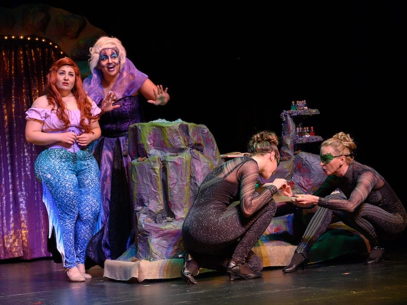 The lead voices are superb. Neva Keuroglian Sullivan as Ariel and Ryan Kieft as Prince Eric have powerhouse chops and the verve to match the best in musical theater around town. Iris Dewitt as evil sea witch Ursula belts out her “Poor Unfortunate Souls” with fiendish glee. Alexandra Curd as crustacean buddy Sebastian has a playful Jamaican lilt and frolics out a rousing “Under the Sea.” Once the xylophone notes ping out the familiar tune, it takes willpower to stay seated. Same thing with “Kiss the Girl,” where the full ensemble hits the stage in colorful attire. Singer/dancers Anna Legrady and Leigh Wirth as Flotsam and Jetsam showcase killer moves and gorgeous voice combos.
