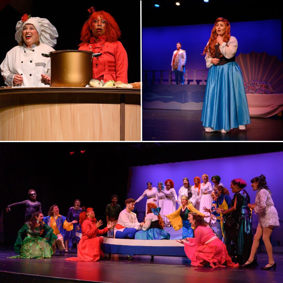 TOP LEFT: Sarah Robinson(Chef Louis) and Alexandra Curd (Sebastian); TOP RIGHT: Ryan Kieft (Prince Eric) aand Neva Keuroglian Sullivan (Ariel); ABOVE: The Company, in ‘Disney’s The Little Mermaid.’ Photos by Bruce Rosenberg.