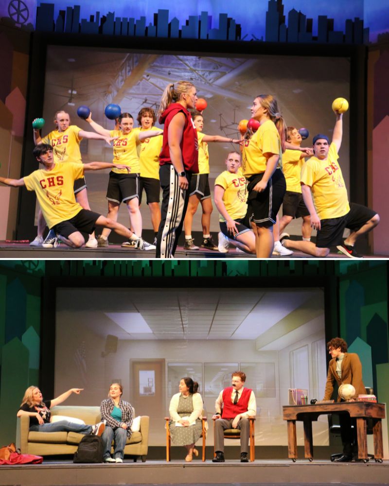 TOP: Clare Kolasch (Ms. Meyers) and Katie Tirrell (Ellie Blake) with Upper Room Theatre’s ‘Freaky Friday’ students; ABOVE: Laura Mills (Katherine Blake), Katie Tirrell (Ellie Blake), Kara Lilly (Mrs. Luckenbill), Daniel Ferguson (Señor O’Brien), Joshua Ewalt (Dr. Ehrin) in ‘Freaky Friday.’ Photos by Rich Zavadowski.
