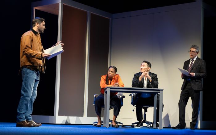 A clean minimalist set by Arnulfo Maldonado, with rotating open-sided cubes, allows for the easy transitions of scenes, enhanced with focused spotlighting and changes in solid colors by Lap Chi Chu, and back wall screens that display projections by Yee Eun Nam highlighting the critical reviews and deprecating comments leveled against DHH, which are also heard as voiceovers in the clear sound design by Caroline Eng and Kate Marvin. Costumes by Anita Yavich, with hair and make-up by Will Vicari, signal the actors’ frequent shifts in roles and identities (including the now-Asian Marcus wearing a Nehru jacket!).