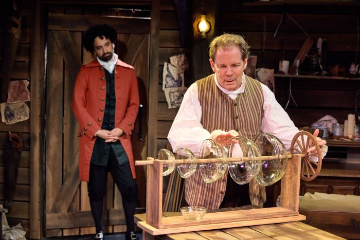 An authentic artistic design recreates the style of the 18th century and transports us into the world of the Franklins. Riw Rakkulchon’s stationary aged wooden set and antique furnishings function smartly as the various sites, from a barn in Philadelphia to the ship crossing the Atlantic to the meeting rooms in London and NJ, with a window through which we see the lightning and hear the thunder that fascinated Ben, with lighting by Carolina Ortiz Herrera and sound (and original composition) by Daniela Hart, Bailey Trierweiler, and Noel Nichols of Uptown Works. Specific props by Thomas Jenkeleit highlight the contributions of the elder Franklin as inventor of the lightning rod, urinary catheter, glass harmonica, and bifocal glasses, and period-style costumes by Christopher Vergara are impeccably researched and replicated.
