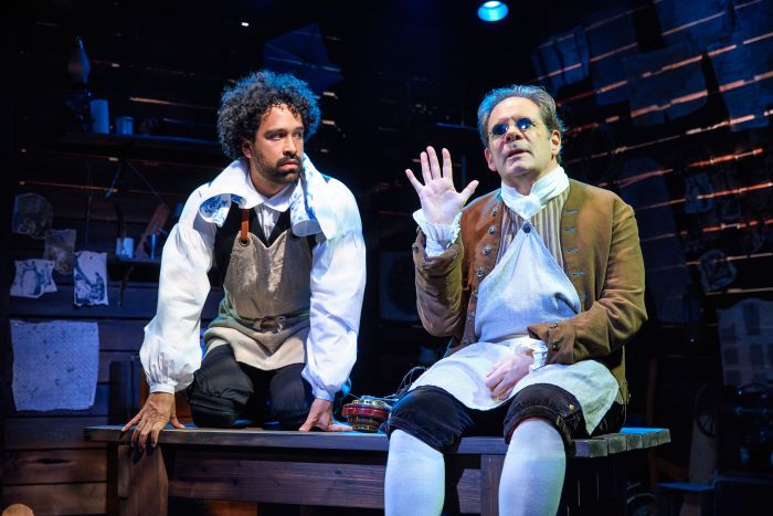 Starring the perfectly cast, laughably discordant duo of Thomas Jay Ryan as Benjamin Franklin and Noah Keyishian as William Franklin, Suh’s quick-paced storytelling and Ike’s active blocking take us through six significant dates and locales in their lives, from 1752-85, Philadelphia to the Atlantic Ocean, London, and New Jersey, where William, a British Loyalist, served as Royal Governor, pushing the already strained family dynamics to the breaking point, and, of course, triggering running Jersey jokes and eye-rolling from Ben (it’s all in jest; Suh is a professor at NJ’s Princeton University).