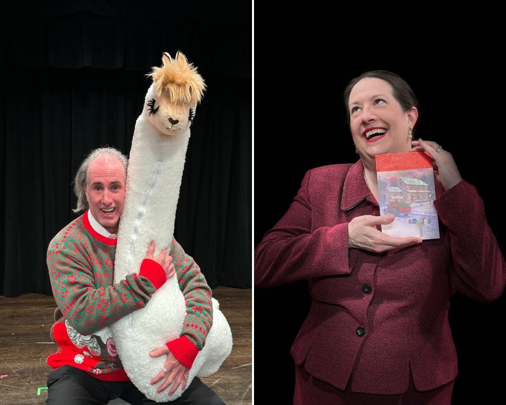 The talented cast brings the holiday spirit front and center with laughter and life, accompanied by cheerfully clad Andrew Mauer at the piano. Terence Heffernan must be seen to be believed as a New York borough-sounding angel with wings and halo, providing tips to Be Kind, with mannerisms and intonations straight out of the Bowery. Rose Hahn as daughter Deb tries desperately to stake her ground between her judgment-prone Mom and her newly wedded husband Sean, played with anxious irritation by Matthew Marcus. Marcus is also marvelous as a youngster scampering across the stage and theater in protest, loudly exclaiming, “My Mom made me write these Christmas cards!” Christen Stephansky has the chops to play the ubiquitous “Mom” in the sketches along with comedic skills to add to the cascade of laughter. Director John Morogiello keeps everyone engaged and the action flowing in movement and temperament as the characters rip through their numerous roles, reluctantly pose for Christmas card group photos, and even speak through stuffed toys. In one case, a couple of penguins sit on a ledge, shivering not from the freezing cold but in terror from the close proximity to a large white polar bear who politely ponders why they seem so miserably frightened, but then as the lights dim, you barely catch the Chomp! Yes, the rambunctious and nonstop silliness leaves no goofy snowball behind.