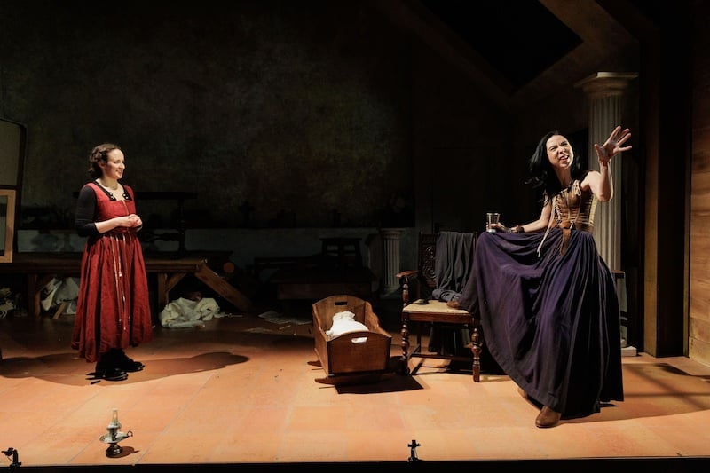 It was important for me to make each one very distinct. Right away, for me, that meant physicality. Where each character’s “center” is. Maria is earthy and relaxed and all pelvis. Tuzia lives in the pinched, sour expression on her face. Matteo is a long-limbed tween who feels awkward in his body and in front of people. Mother Superior is all elbows and angles, up and down, bony fingers pointing towards righteousness. Each character also speaks from a different place — deep and chesty, or cracking and high in the head. Mellow and smooth, or sing-songy, like a warning. It was more natural for me to work from the outside in on these roles since they are all so different and supporting to Kate’s lead as Artemisia.