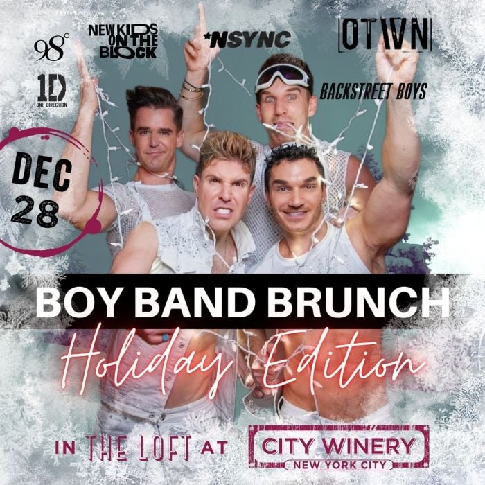 Boy Band Brunch: Holiday Edition plays Saturday December 14, noon-2 pm and 3:30-5:30 pm, and December 28, noon-2 pm (doors open a half hour in advance of show time), at City Winery NYC, 25 Eleventh Avenue, NYC. For tickets (priced at $37.40, including fees; brunch is not included, and there is no food/drink minimum), go online.