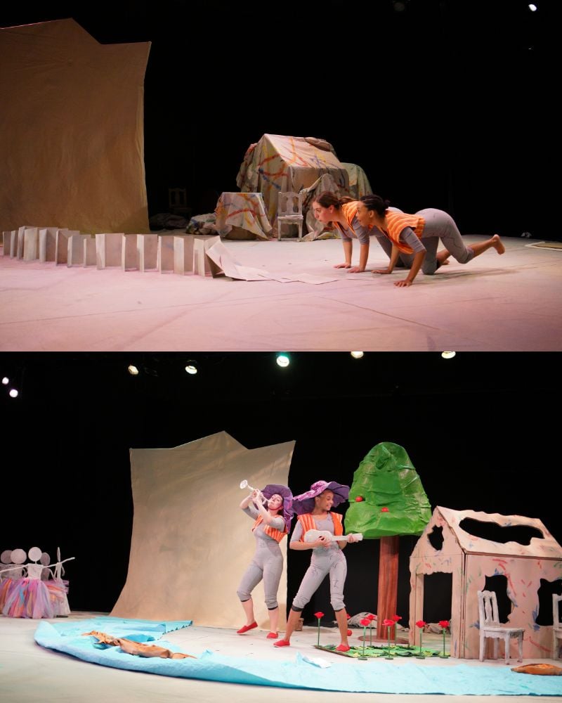 When the audience first views the set, everything is covered in colorful scraps, but as the show progresses, the performers dramatically reveal the next item for their inspiration while also continuing to utilize the scraps. This intermittent revelation of set pieces throughout allows for constant reengagement with the younger audience members. The simplicity of the set and props don’t limit the performers; in fact, I was constantly impressed by their ability to evoke very specific events, such as a fashion show, through only paper, lights, and sound. The simplicity also leaves room for the audience to fill in some gaps, encouraging them to use their imagination along with the performers.