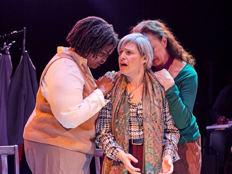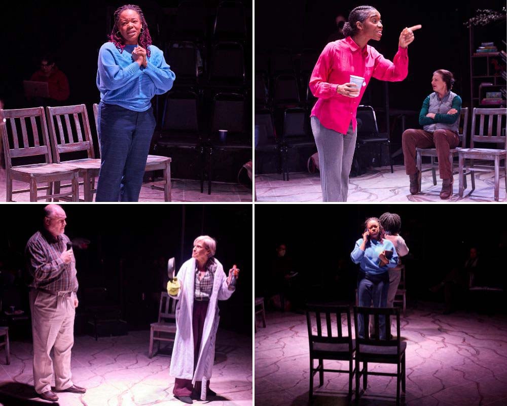 The church basement space has been configured to feel as closely contained as possible yet accommodate a small audience seated on risers around a modest playing area. The stage is set with ten gray slat-back chairs that the cast of six repeatedly rearranges to mark changes between scenes. The proximity is the point, the intimate immediacy is the intent, for we are here to witness up close a dramatized support group for people impacted by the pressure of caring for impaired people in a country that fundamentally doesn’t.