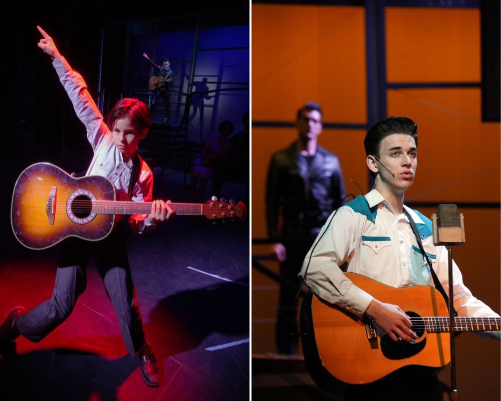 The show begins in the late 1940s with a young Elvis (Grayson Lewis) at his humble home in Memphis, Tennessee. Though his family is poor, love abounds, shown when his mother Gladys (Sheri Hayden) and father Vernon (Andy Braden) save their money for months in order to buy him a guitar for his 11th birthday. Elvis is inspired by a number of African-American musicians, shown in the number “Welcome to Beale Street,” which includes Leo Jasper Davis as Roy Brown, Anthony Williams as Jackie Brenston, and Tayandra Allan as Sister Rosetta Tharpe. While this is the music he loves, racial tensions of the time force him into the “crooner” stereotype, and a teenage Elvis (Luke Purcell) bores the founder of Sun Records, Sam Phillips (Andy Braden), who says the timid teenager “acts half his age and sings like he’s twice it.” In the memorable number “That’s All Right,” Sam happens upon Elvis and his band having some fun and encourages the exciting new sound.