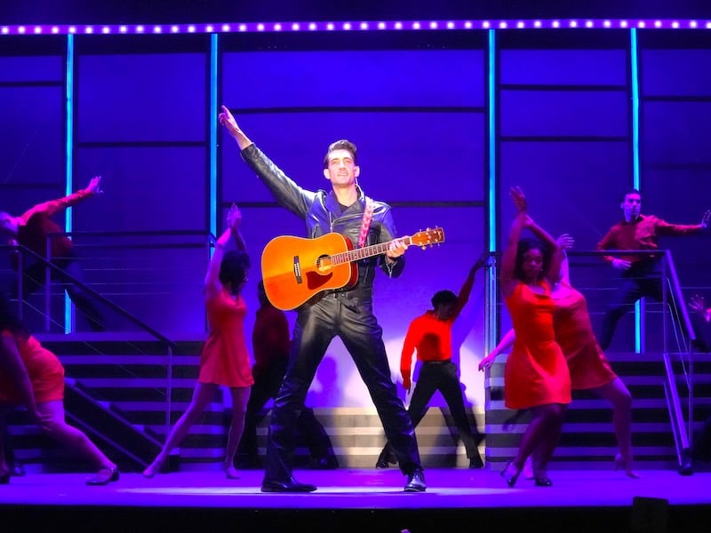 At first, Sam has a difficult time getting radio stations to play Elvis, with one DJ exclaiming, “He’s a white boy! You trying to get me killed?!” While older people face Elvis with backlash, his popularity soars with younger people. “Elvis Mania Medley” is a great number, performed by his zealous young “fans,” with fun group choreography. As his star rises, so do the pressures of newfound fame, and an already overwhelmed young Elvis is forced to face the death of his beloved mother, a loss that overarches both the rest of the production and Elvis’ life itself. Accompanied by his teen and kid self, the adult Elvis Presley, played by Elliot Litherland, serenades his mother with her favorite song, “Peace in the Valley,” a poignant song with a sadness that echoes through the rest of the show.