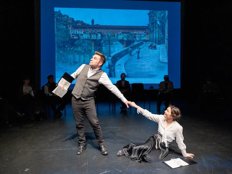 There are lots of moving parts in this expansive reading that cover Lucy’s dilemma of becoming engaged to an upper-crust crust, stodgy suitor while the passionate George Emerson has positioned himself in her sights. The production also reflected distinct geographical images, from an Italian piazza to a beautiful English country garden presented via terrific sound and projections by Ron Murphy. Exquisite direction by Kelly Newman O’Connor and David Minton kept the 17 performers engaged and moving choreographically with precision, including an adorable “double carriage ride” with the sound of clopping horses and actors bouncing in their chairs.