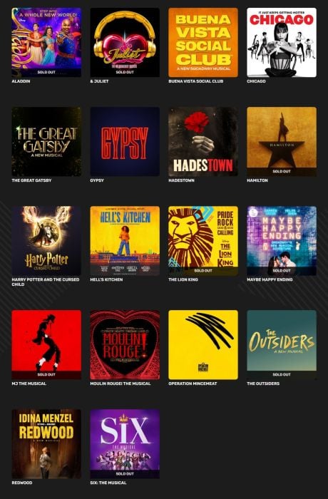 The participating shows are: Aladdin; & Juliet; Buena Vista Social Club; Chicago; *The Great Gatsby; Gypsy; Hadestown; Hamilton; Harry Potter and the Cursed Child; Hell’s Kitchen; The Lion King; Maybe Happy Ending; MJ; Moulin Rouge! The Musical; Operation Mincemeat: A New Musical; The Outsiders; Redwood; and *SIX: The Musical.