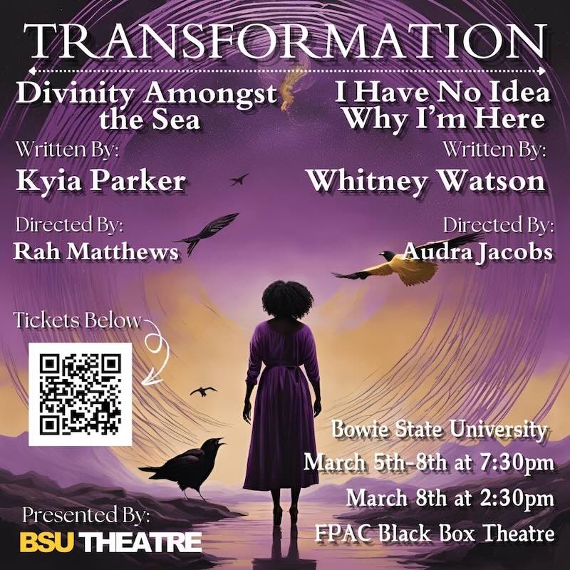 Transformation opens Wednesday, March 5 and plays through Saturday, March 8, 2025, presented by Bowie State University Theatre performing in the Department of Fine and Performing Arts Black Box Theatre at Bowie State University, 14000 Jericho Park Rd, Bowie, MD. Seating is limited. For more information and to purchase tickets ($15 general admission; $10, student, senior, faculty, staff), go online.