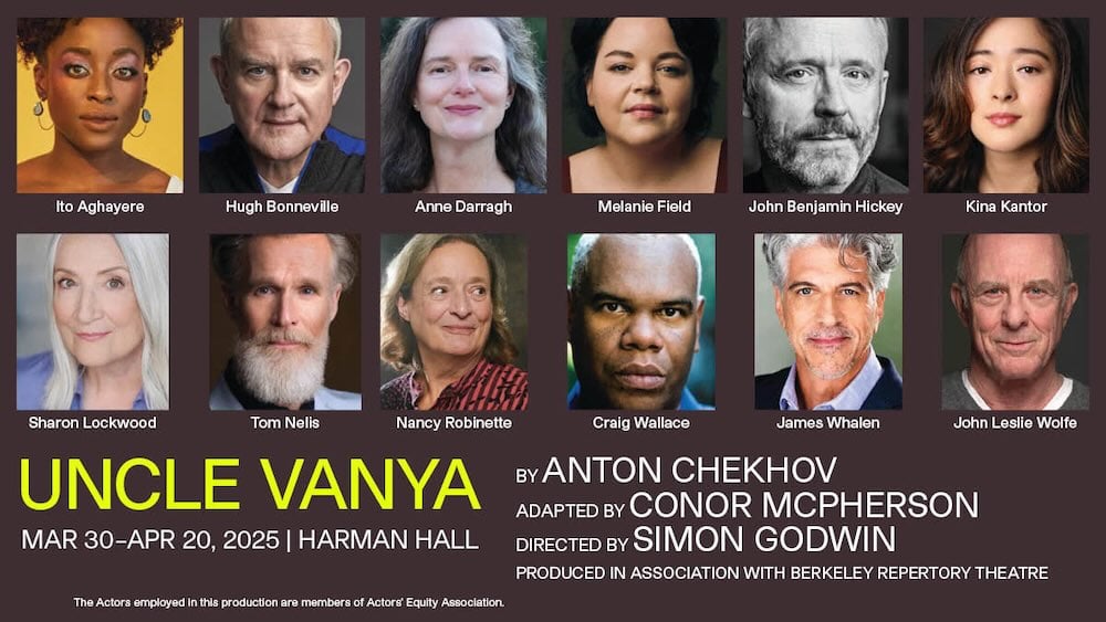 Accompanying “a stellar performance by Hugh Bonneville” (BroadwayWorld), Uncle Vanya also features Tony Award-winner John Benjamin Hickey (The Normal Heart) and an ensemble cast that includes Ito Aghayere (Star Trek: Picard), Melanie Field (A League of Their Own), Sharon Lockwood (Mrs. Doubtfire), Kina Kantor (Mrs. Christie West Coast Premiere), Tom Nelis (Broadway’s Girl From the North Country, Indecent), Nancy Robinette (STC’s Everybody, Sweet Bird of Youth), and Craig Wallace (STC’s King Lear, Our Town). Understudies for Uncle Vanya include Anne Darragh, James Whalen, and John Leslie Wolfe.