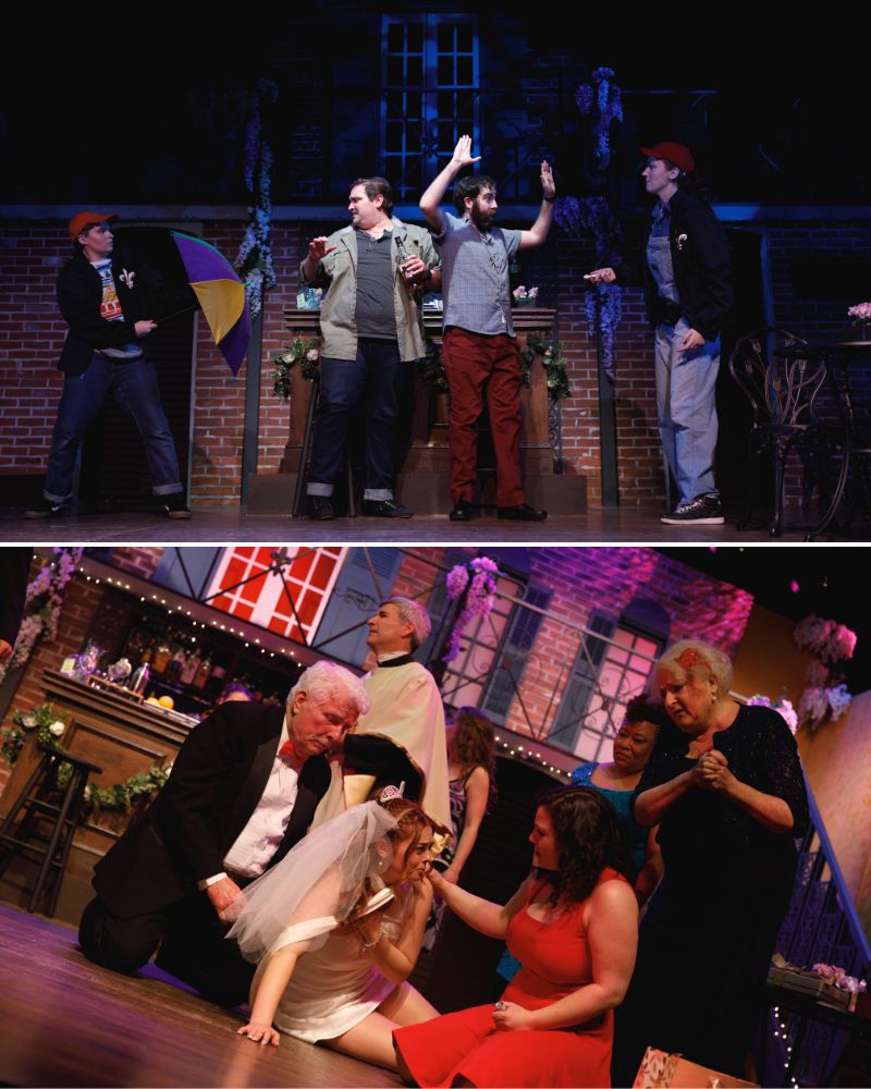 As one of the best-resourced community theaters in the area, LTA can be counted upon for excellent physical productions, and Much Ado is no exception. Julie Fischer’s two-level set is delightful to look at, with the ironwork on the balcony providing a good NOLA touch and smoothly functional as well. The active, multicolored lighting design (Jeffrey Auerbach and Kimberly Crago) matches well the locale and pace of the action. Night scenes are lit convincingly, and specials highlight actors giving monologues.