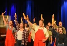 The 10-piece orchestra directed behind the scenes by Cathy Drummond makes the show much better than it would have been with a recorded track, layering its lively accompaniment onto songs as the actors phased out their onstage playing. The orchestra was invisible to the audience except when Jack Dusek (trumpet) and Joe MacFarlane (saxophone) delightfully ambled onstage to add emphasis to Luke Tessier’s amazing rendition of “I Love You Baby.”