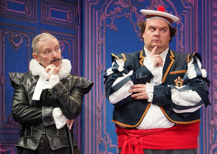 Directed by Red Bull’s Founding Artistic Director Jesse Berger, a fully committed and irresistibly zany cast of eight delivers the whirlwind of antics and scheming with spot-on comic timing, madcap physical comedy, and riotous embodiments of the over-the-top characters, embracing their inordinate self-obsession and self-interest, guises and lies, potty humor and sexual innuendo with abandon, and never missing a beat in the fast-paced door-slammer chase scene or the witty revised lyrics to such famous later-day tunes as “La Marseilles” (created in 1792 and adopted as the national anthem of France in 1795) and the 20th-century “La Vie en Rose” (written by Édith Piaf in 1945 and released in 1947), “I Dreamed a Dream” (from the 1980 musical Les Misérables), and “Hooray for Captain Spaulding” (from the Marx Brothers’ 1928 Broadway musical Animal Crackers and the 1930 film version, which would become Groucho’s signature song). It all makes for one wild and thoroughly entertaining ride through the centuries and the exploration of human behavior that persists and continues to warrant skewering.