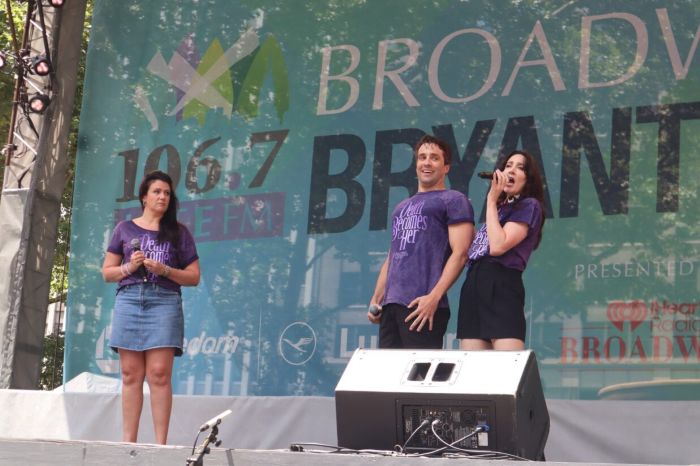 This week’s installment of the free lunchtime series Broadway in Bryant Park, which plays for two more Thursdays in July on the outdoor stage between the Fountain Terrace and the great lawn, featured a sizzling selection of numbers by the talented casts from six of Broadway’s long-running hits (Wicked; Chicago; and The Book of Mormon) and new musicals (Death Becomes Her; Just in Time; and the revival of Gypsy). Hosted by 106.7 LITE FM’s Helen Little, co-hosted by Natalie Charlé Ellis (now appearing in Death Becomes Her), and sponsored by AMDA College of the Performing Arts – with current students and recent graduates Abigail Adu, Maya Bregman, Adianna Cruz, Ana Daniela Perez Davis, Katelee Guzzi, and Yaneilee Velez joining AMDA alum Andres Quintero (who made his Broadway debut in Moulin Rouge! The Musical) for a pre-show set (including a beautiful solo dance to “If You Go Away” and Quintero’s passionate lead vocal on “One Song Glory” from RENT) – the concert offered the audience an entertaining way to spend a hot summer day revisiting favorite shows or being introduced to which ones they should see next!