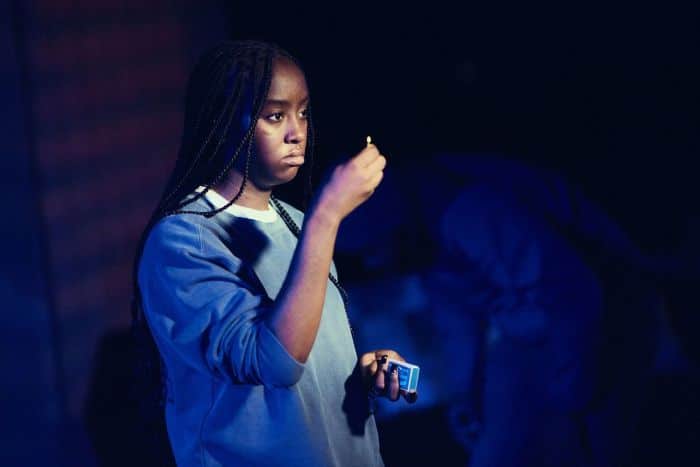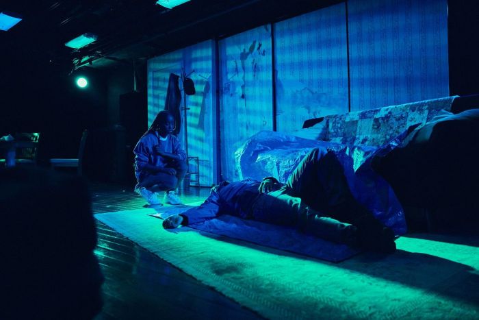 Subsequent scenes jump to Fran’s adulthood, marriage to Winter (Eric Easter), who becomes progressively stressed out and frustrated, and the birth of their infant daughter Maeve. After that we see a grown and bleeding Maeve (Feyisola Soetan), representing the last generation who’s been physically affected by the unlivable conditions and destruction of the house by seeping raw sewage and deadly toxins that leave the living room rug and walls filthy, the expensive and extensive much-needed repairs that were not fully addressed, despite Cavin, who coughs a lot, obtaining a sizable loan from the persuasive Copal, a local politician supporting the industrial sprawl and proud of his rising status (played by Aaron Dorelien filling in for Isaiah Joseph at the performance I attended), and a mysterious fire that may or may not have been intentionally set.