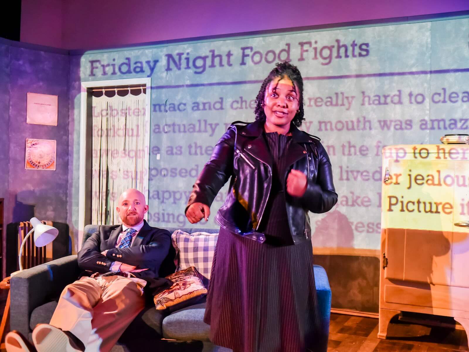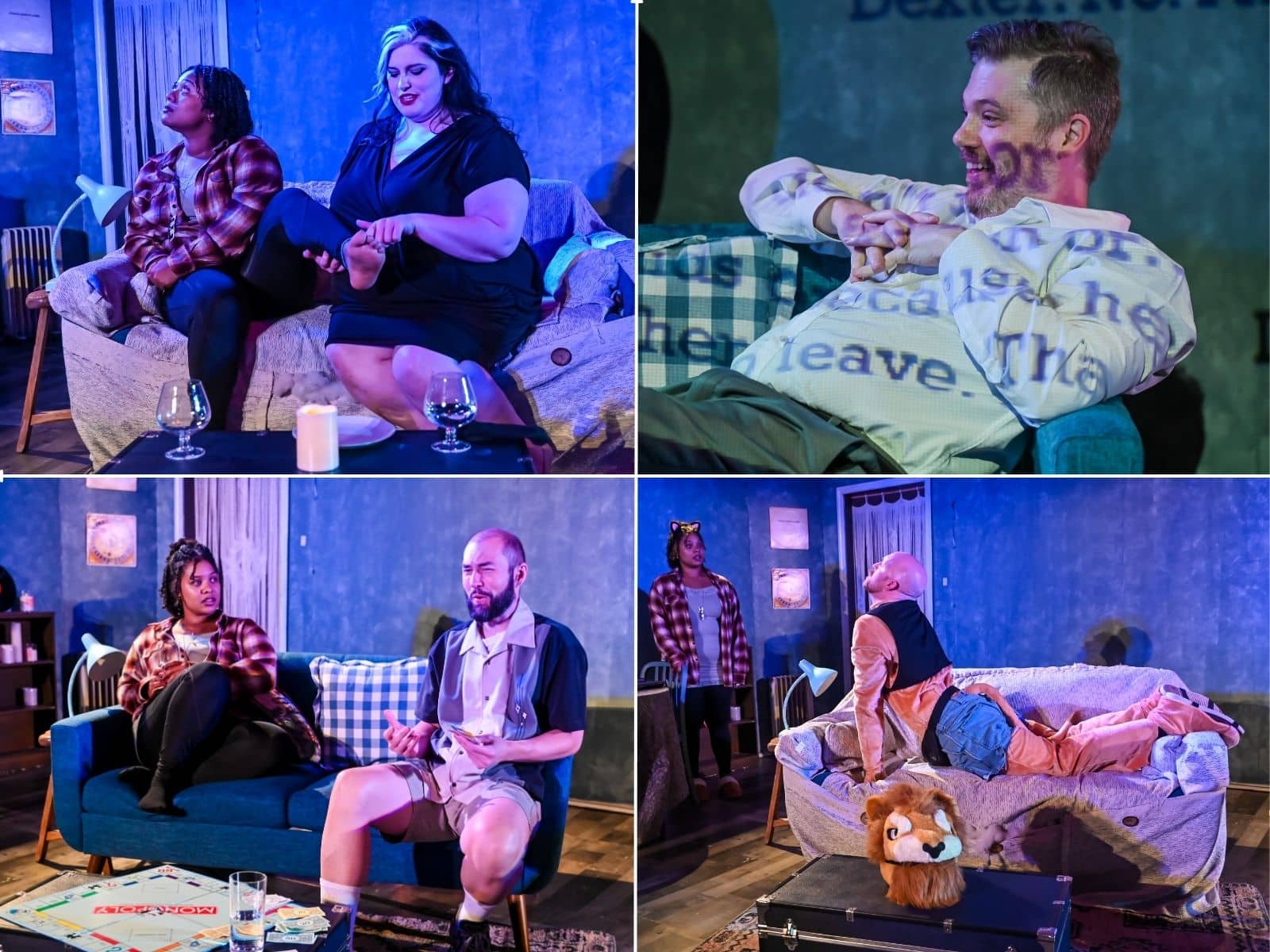 The overall use of the stage was manipulated with commendable choreography, considering the tight space provided. An excellent example is the scene in which Maggie is scrolling fervently through an outpouring of cruel online comments after rumors break out that she’s been serving as a sex worker. As she scrolls, seated on the couch in the center of the stage with her head buried in her phone, the other actors emerge from each side and glide hurriedly across the stage from all directions, reciting the messages as they go, crossing paths in a sort of organized chaos, perfectly mirroring the spiraling anxiety in Maggie’s mind, and almost assaulting the audience into a more present sense of empathy toward Maggie’s climaxing emotions.