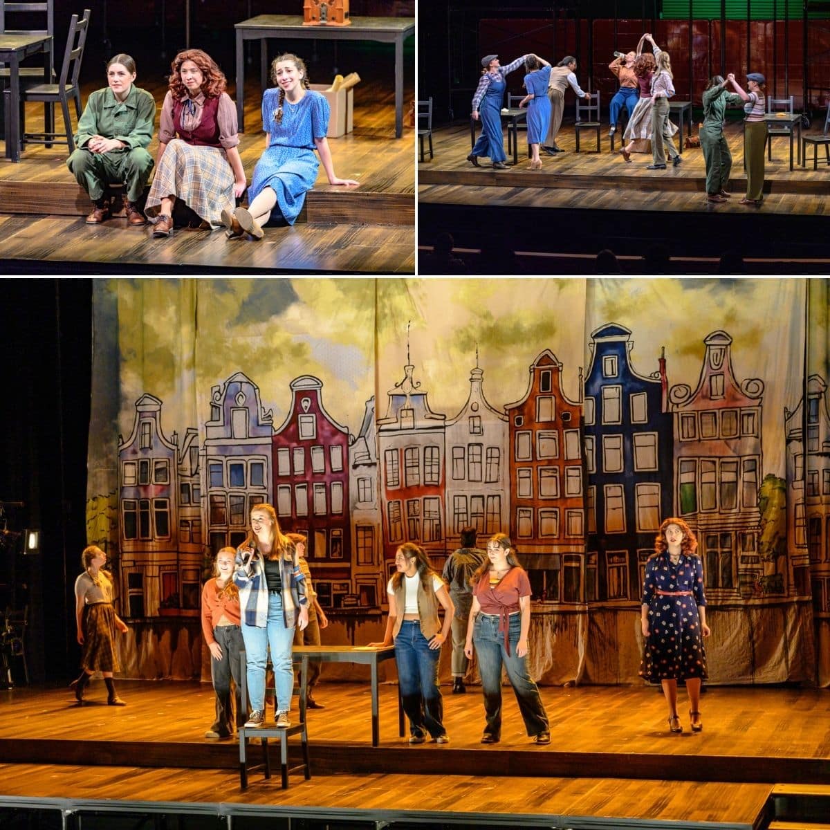 TOP LEFT: Lucille Rieke as Truus Oversteegen, Maddy Cooper as Hannie Schaft, and Mira Gross-Keck as Freddie Oversteegen; TOP RIGHT AND ABOVE: The Cast, in ‘Disarming Girls.’ Photos by Jeff Watts.