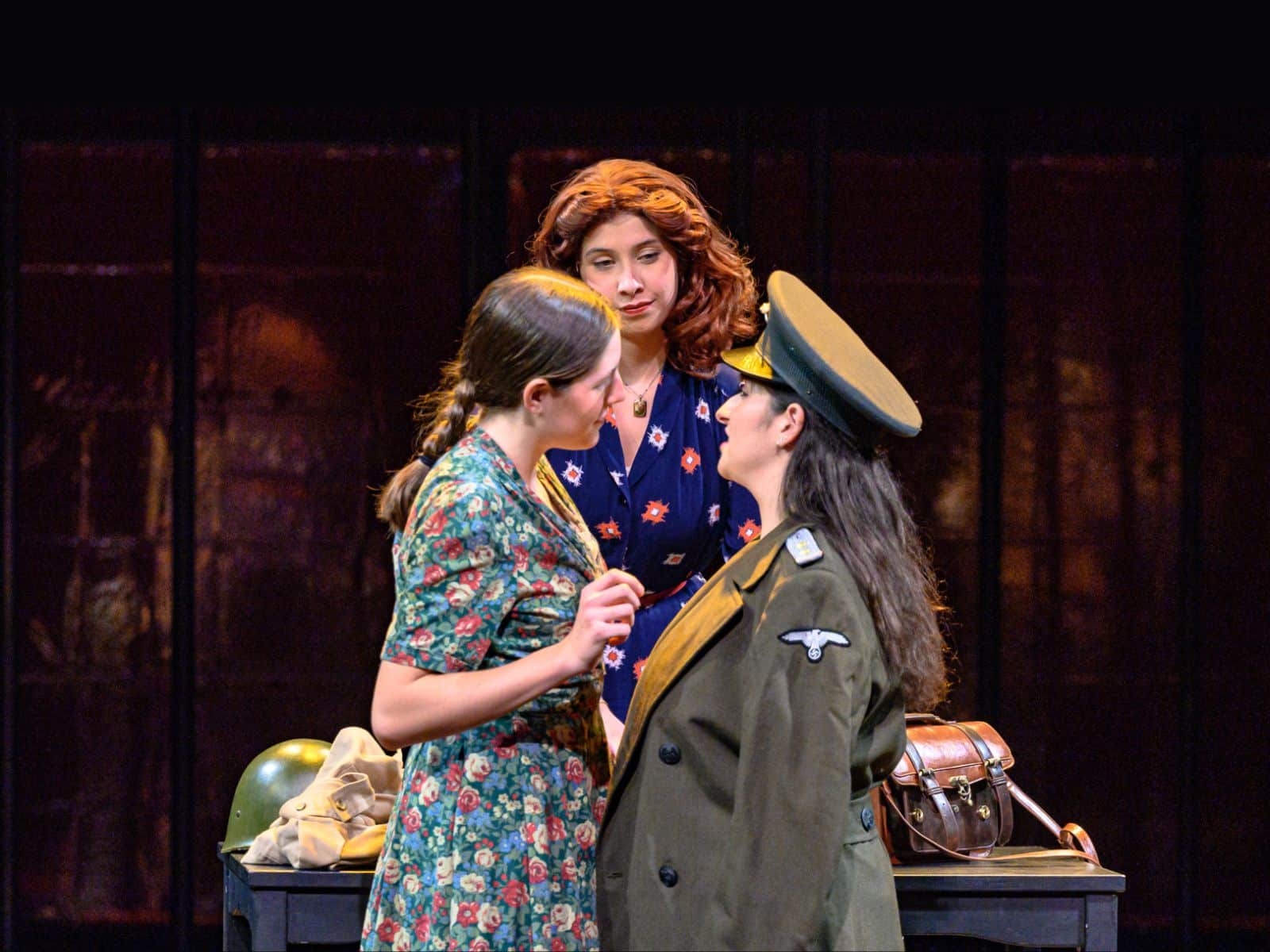 Lucille Rieke as Truus Oversteegen, Maddy Cooper as Hannie Schaft, and Gabriela Cohen as Captain Böhm in ‘Disarming Girls.’ Photo by Jeff Watts.