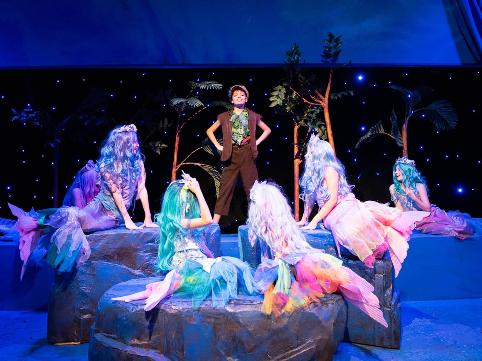 Whit Jenkins as Peter Pan with the Diva Mermaids of the Company of ‘Peter Pan and Wendy.’ Photo by William Gallagher.